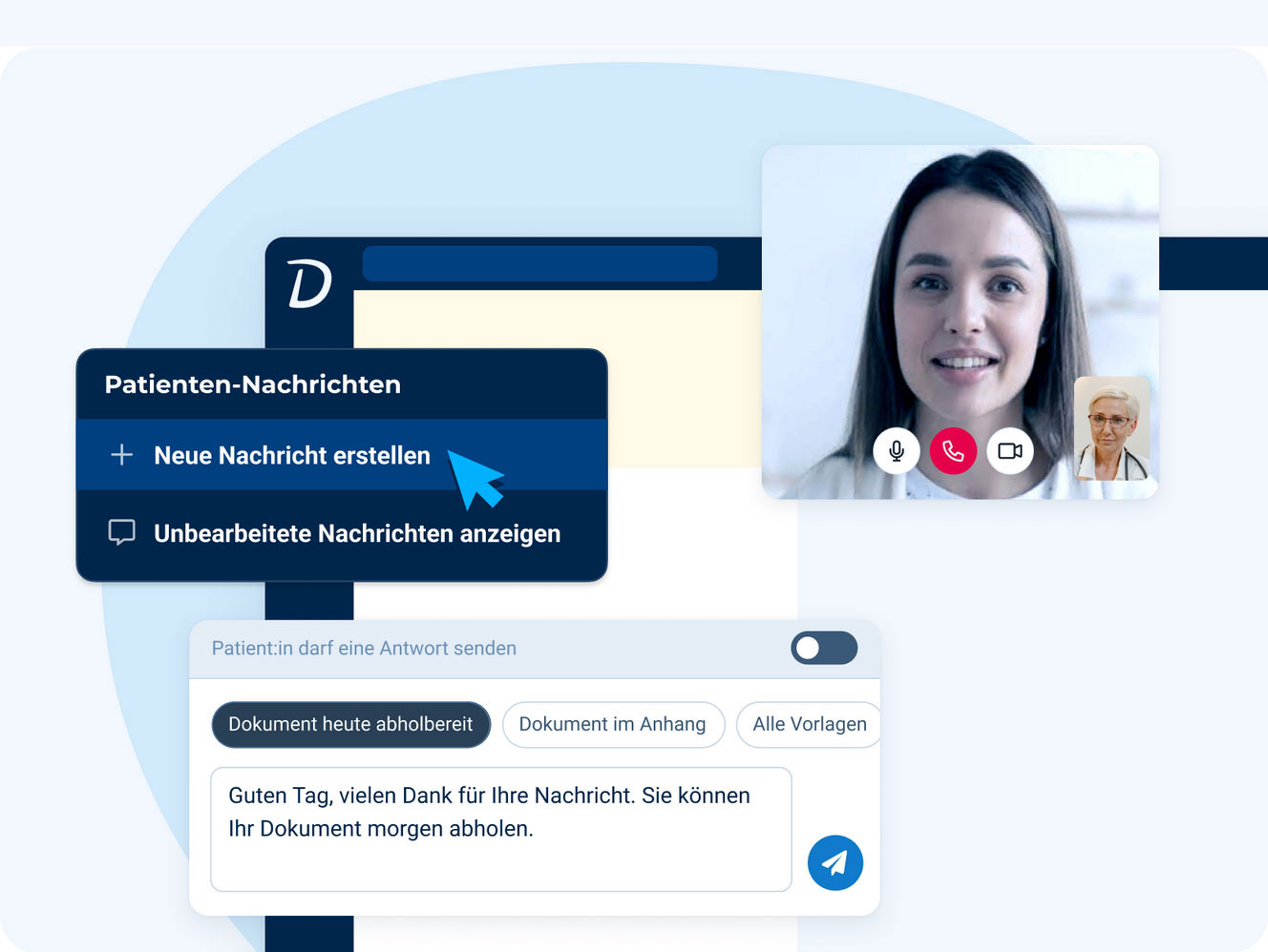 Kommunizieren Sie einfach und sicher mit Ihren Patient:innen über Patientennachrichten oder auch aus der Ferne mit der Videosprechstunde. Nutzen Sie den automatisierten Recall zur Wiedervorstellung mit voller Kontrolle über die Buchungen.