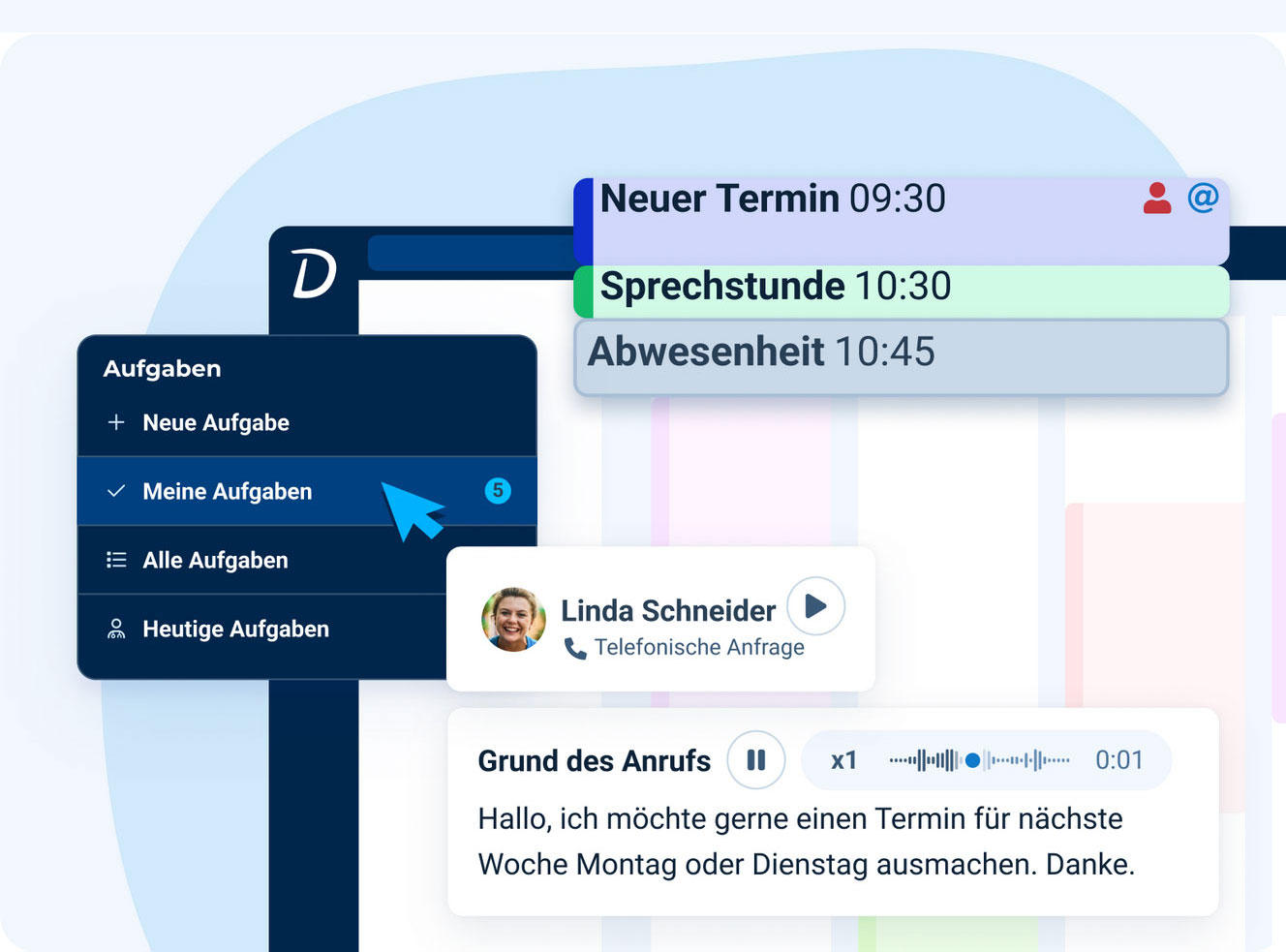 Nutzen Sie den digitalen Kalender sowie den KI-basierten Telefonassistenten für Online-Terminbuchungen und Entlastung am Telefon, die Warteliste zur Reduktion von Terminausfällen und den Aufgaben-Manager für effizienteres Praxismanagement.